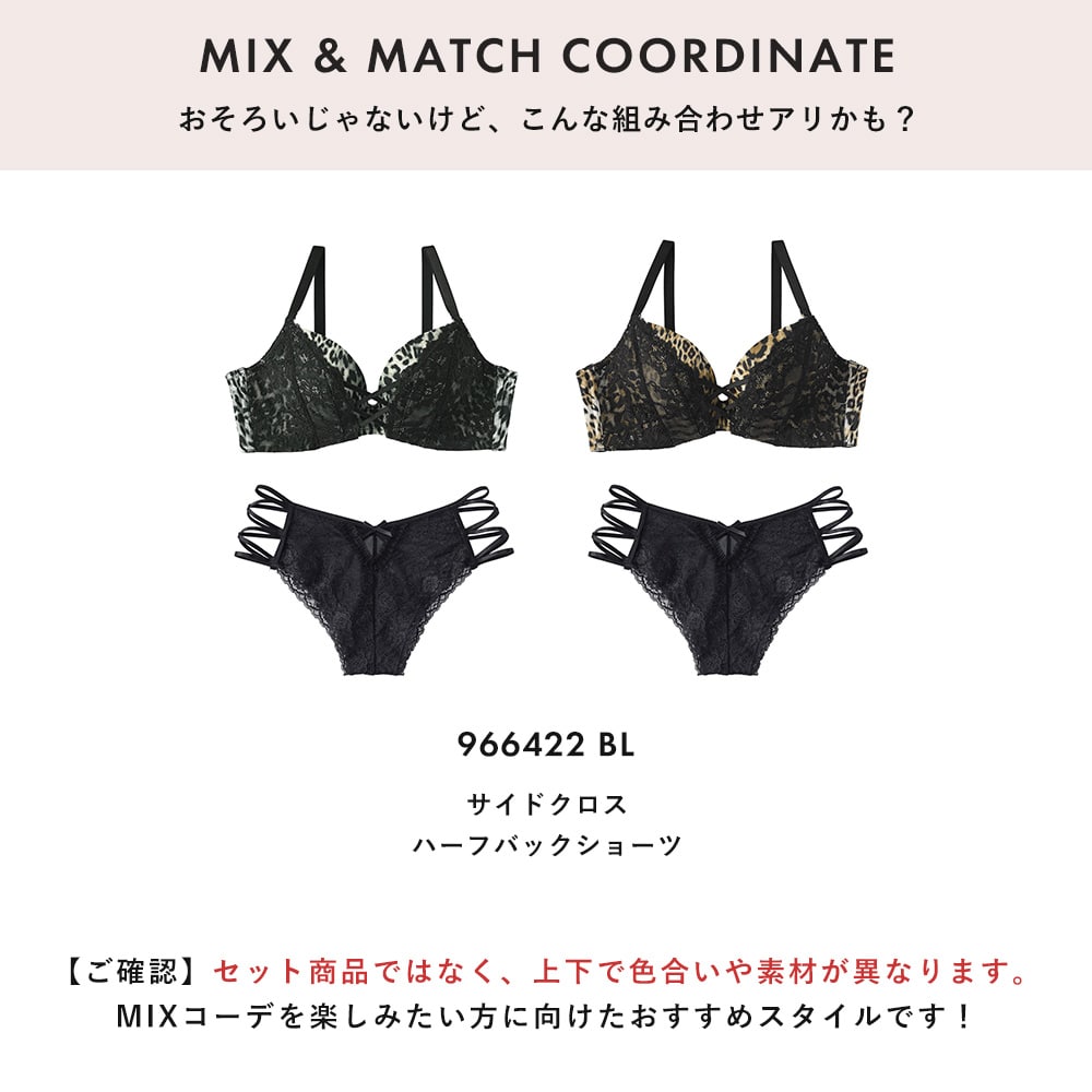 つけた瞬間に谷間ができる超盛ブラ(R)シリーズに、レオパード柄プリント×ブラックレースのセクシーなブラジャーが登場です。下厚超盛パッドでボリュームのある谷間をメイクしながら、サイドの脇高ボーンで集めたお肉をしっかりキープ。しっかりと形成された立体的なカップのおかげで、ふっくらとした美しい丸みのあるバストシルエットを生み出します。ワイヤーはふかふかの生地に埋め込むことで、カップ内側の肌当たりをソフトに。背中はU字バックで動いてもズレにくく、安定感のあるつけ心地でよりいっそう脇肉を逃がさない仕様になっています。さらに、左右のバストを脇部分のレースとWクロステープで引き寄せてカップ全体を包み込むことで広がりを抑え、しっかり谷間をキープします。