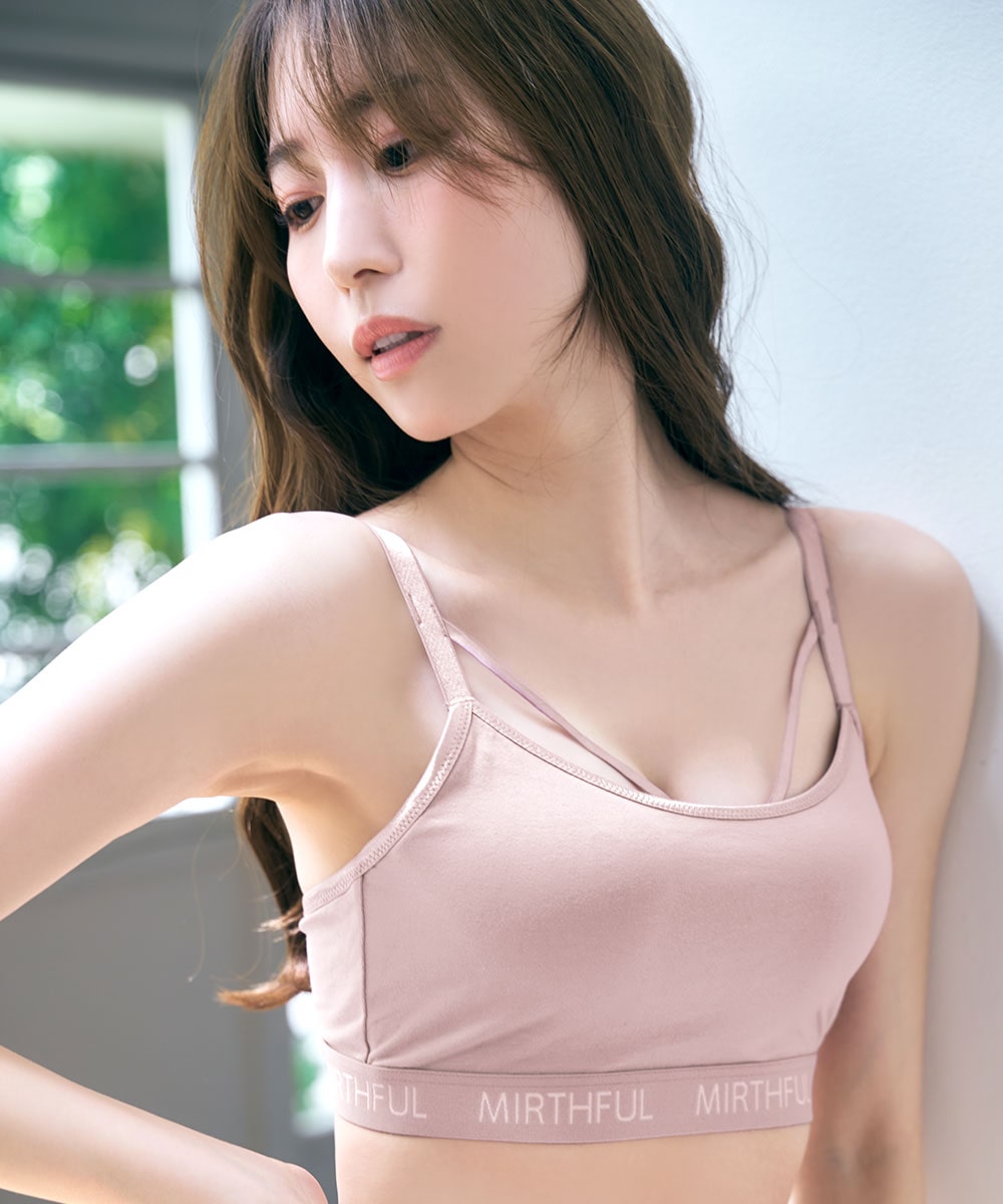 ワイヤーがなくても超盛れる!と話題の「ノンワイヤー超盛ブラ(R)」に、太ゴムのアンダーにキャミソール風のベア天素材を重ねた、スポーティな新デザインが登場。独自の下厚カップと、脇から寄せたバストをキープしながらホールドする脇高設計で、バストをボリュームアップ。谷間をくっきりとメイクしつつ、ワイヤーなしの楽な着け心地を叶えます。ブラジャーには、伸縮性に優れたベア天竺素材をレイヤード。カップ上部の浮きを軽減しながら、バストの横広がりを防ぎ、自然に中央へ寄せることで、丸みのある美しいシルエットを演出します。さらに、ストラップとブラ本体をつなぐコードテープが、ヘルシーなセクシーさをプラス。スポーティな印象を引き立てます。アンダー部分には「MIRTHFUL」のロゴ入り太ゴムを使用。デザイン性はもちろん、ずれにくく、安定感のあるフィット感も魅力です。また、着用時に圧迫感や痛みを感じやすい脇やアンダー部分にはソフトな素材を使用し、ノンワイヤーならではの快適さはそのままに、シルエットがすっきり見える機能性も備えています。ワイヤーブラが苦手な方や、おうち時間を快適に過ごしたい時にもおすすめです。セットショーツは、肌ざわりの良い綿混素材を使用し、フロント部分に大胆な肌見せデザインを取り入れた、セクシーさのあるプレーンタイプです。