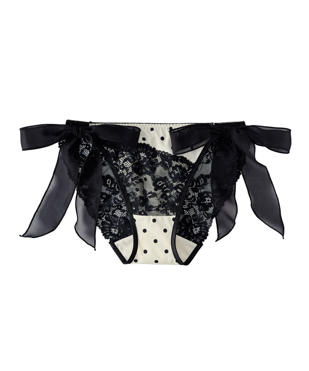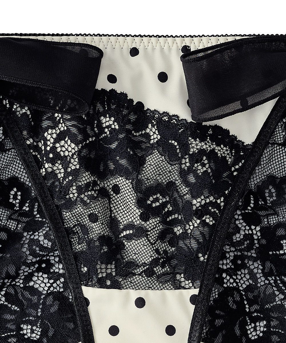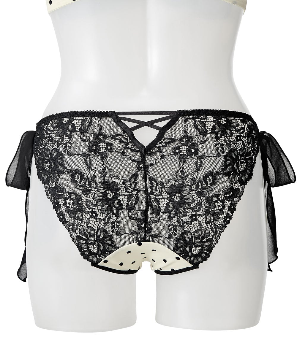 大きなシフォンリボンが目を引く、キュートなデザインのプレーンショーツです。サイドのリボンは実際にほどくことができる紐パン仕様で、ウエストの締め付け具合をお好みのフィット感に調整できます。バックスタイルは総レースにウエスト部分のクロスコードを組み合わせ、セクシーさもプラス。ストレッチ性の高いレース生地は見た目の美しさだけでなく通気性にも優れており、蒸れによる不快感を防いで快適な履き心地をキープします。フロントはカジュアルなドット柄の身生地に、バックと同じ花柄レースを重ねることで、かわいらしさと上品さを両立したデザインに仕上げました。