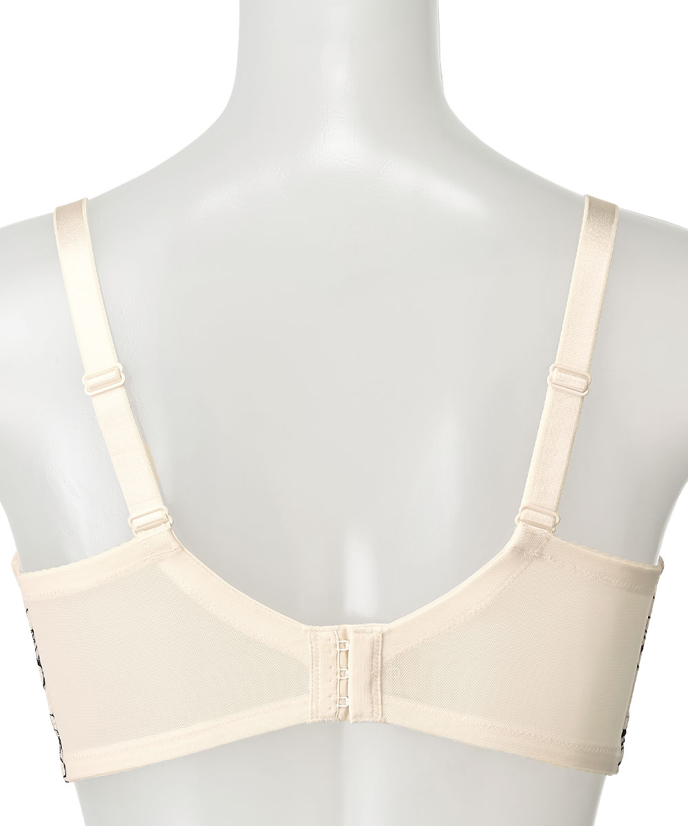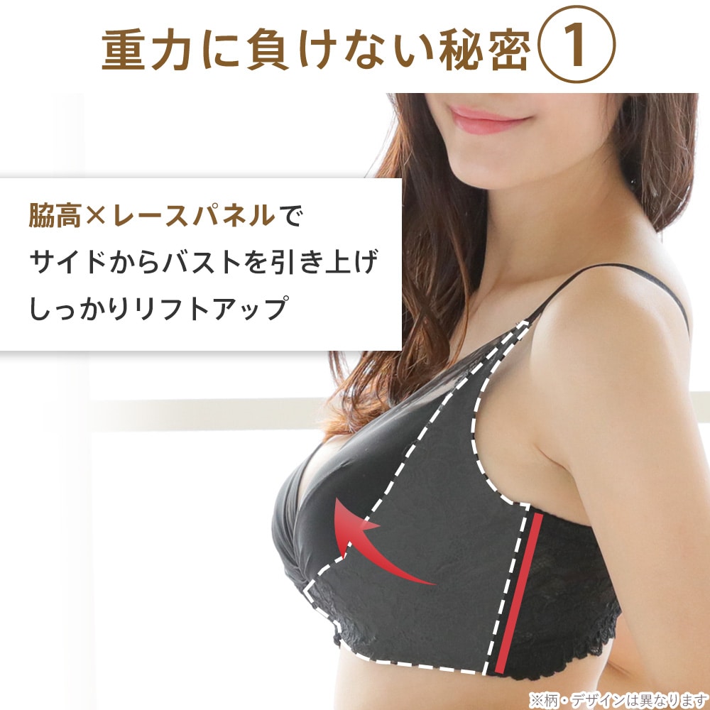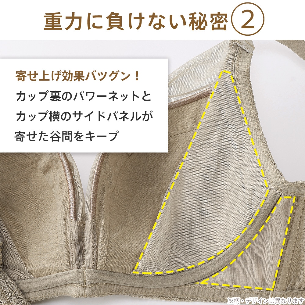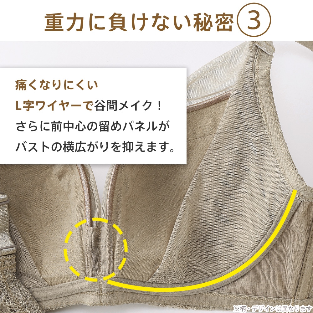 バストが上がる×寄る!重力に負けずキレイな谷間をメイクするブラジャー。美しいシルエットをつくる進化したaimerfeelの脇高ブラにグラマラスサイズ(FGHカップ)が登場です。痛くなりにくいL字ワイヤー採用で、補整ブラなのに着け心地も楽ちん。脇高ボーンで脇肉を寄せ上げ、脇肉すっきり。カップサイドのレースパネルはバストを上に引き上げるリフトアップ効果も。カップ裏はパワーネット×サイドパネルがバストの脇逃げを防ぎ、寄せた谷間をしっかりキープします。デザインは艶のあるサテンカップにチュール素材を重ね、カップのサイドからバックベルトに続く繊細な刺繍花柄レースが上品でエレガント。