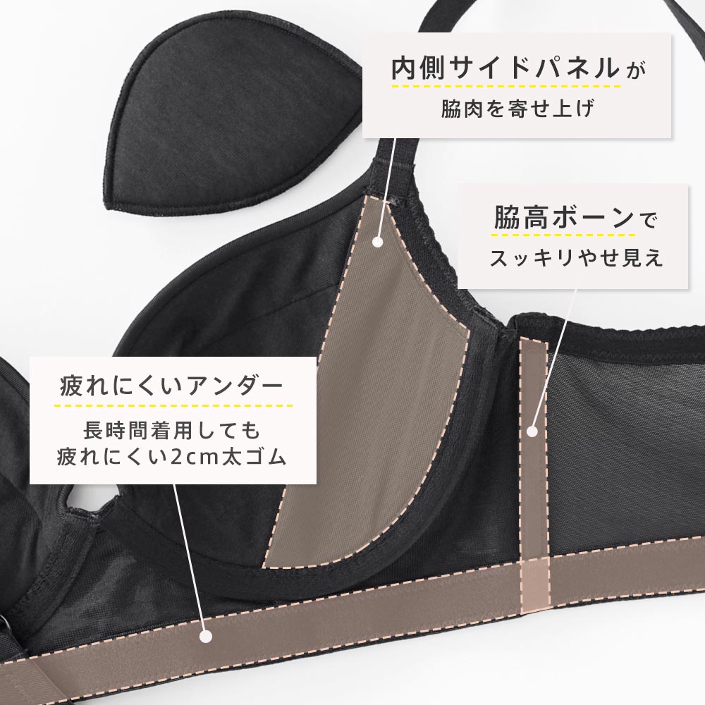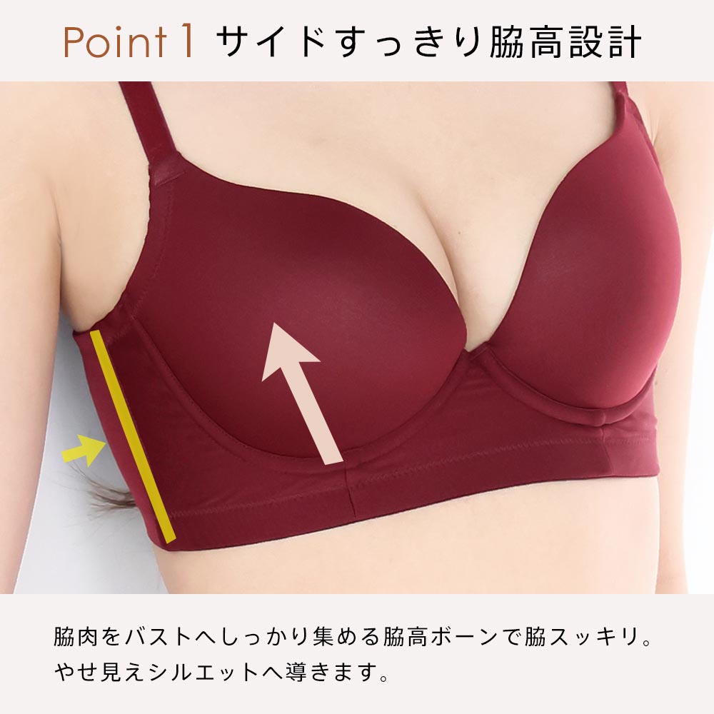 ・脇高設計のサイドボーンが、脇のお肉をしっかりと寄せてすっきり整える。