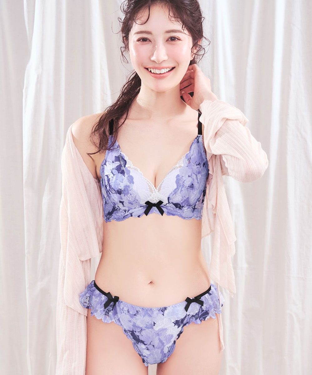 補整ブラ特有の「苦しい・痛い」を徹底的に軽減したこだわりのカシュクールレース脇高ブラ(R)に、繊細な花柄レースに色の濃淡で描かれた花のシルエットをプリントした、立体感のある上品でフェミニンなデザインが登場。余分な脇肉をすっきり整える脇高設計で、レース生地がバストを包み込むように中心に寄せ、優しく谷間をメイクします。また、痛くなりにくいように設計されたL字ワイヤーで長時間の着用でも苦しくなりません。キレイな丸みのあるシルエットで、バストが尖って見えるのが苦手な方も安心です。セットショーツは、バックスタイルに透け感のあるストレッチレースを贅沢に使用した、総レース仕様のプレーンタイプです。