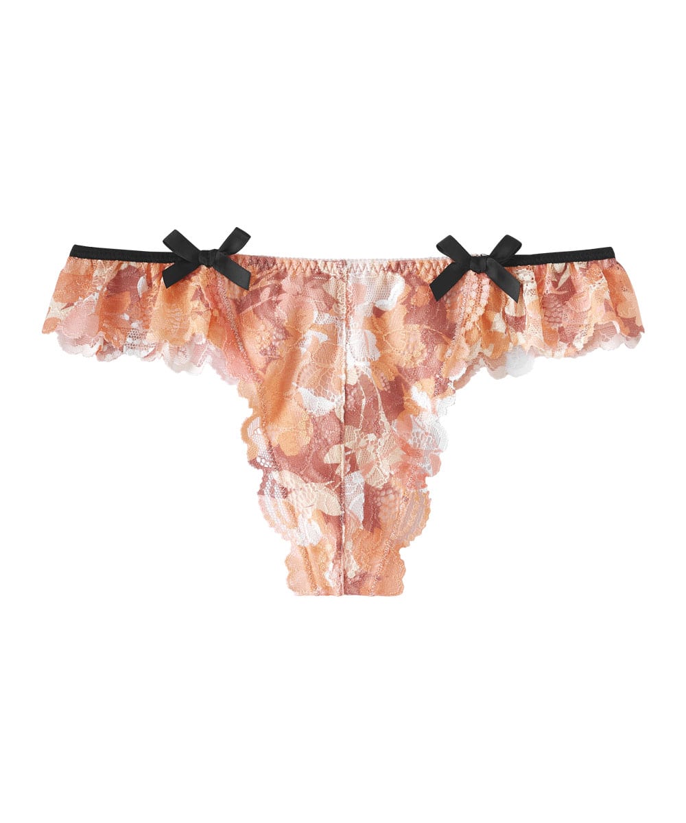 繊細な花柄レースに色の濃淡で描かれた花のシルエットをプリントすることで、立体感のある上品でフェミニンなデザインに仕上げたTバックショーツ。サイドにはふんわりと広がるレースフリルとブラックリボンをあしらい、フェミニンな甘さを添えました。バックスタイルは、透け感のあるストレッチレースを贅沢に使用した、総レース仕立てのソング(タンガ)タイプ。やわらかく伸びるレースがヒップにやさしくフィットし、動きやすさと快適な履き心地を保ちながら、セクシーな後ろ姿と美しいヒップラインを演出します。
