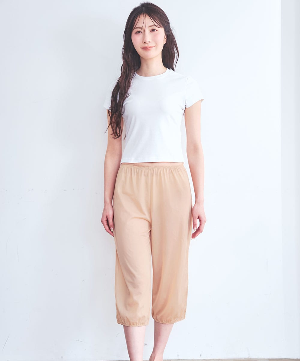 お洒落でかわいいロングボトムコーデの悩みといえば外出先のお手洗い。トイレの床に裾がついてしまう「あの問題」を解決!履くだけ楽ちんぺチコートが登場です!トイレの前にボトムとペチパンツを一緒に巻き上げる簡単動作、これ一枚でボトムの裾が床につかないように長さを調整できます。裾ゴム入りで、しゃがんだ体制でもズレ落ちずに安心。ぺチパンツとしては少し長めのひざ下丈なので、ワイドパンツやガウチョパンツ、裾の大きなイージーパンツやシェフパンツなどを着用している時にもお使いいただけます。さらっとした薄手生地でまとわりつかず、重ね履きが苦手な方でも不快感を感じにくい着用感です。もちろん普通のペチコートとして、白色のズボンを履いた時の下着の透け・チラ見え防止用のインナーとしてもお使いいただけます。