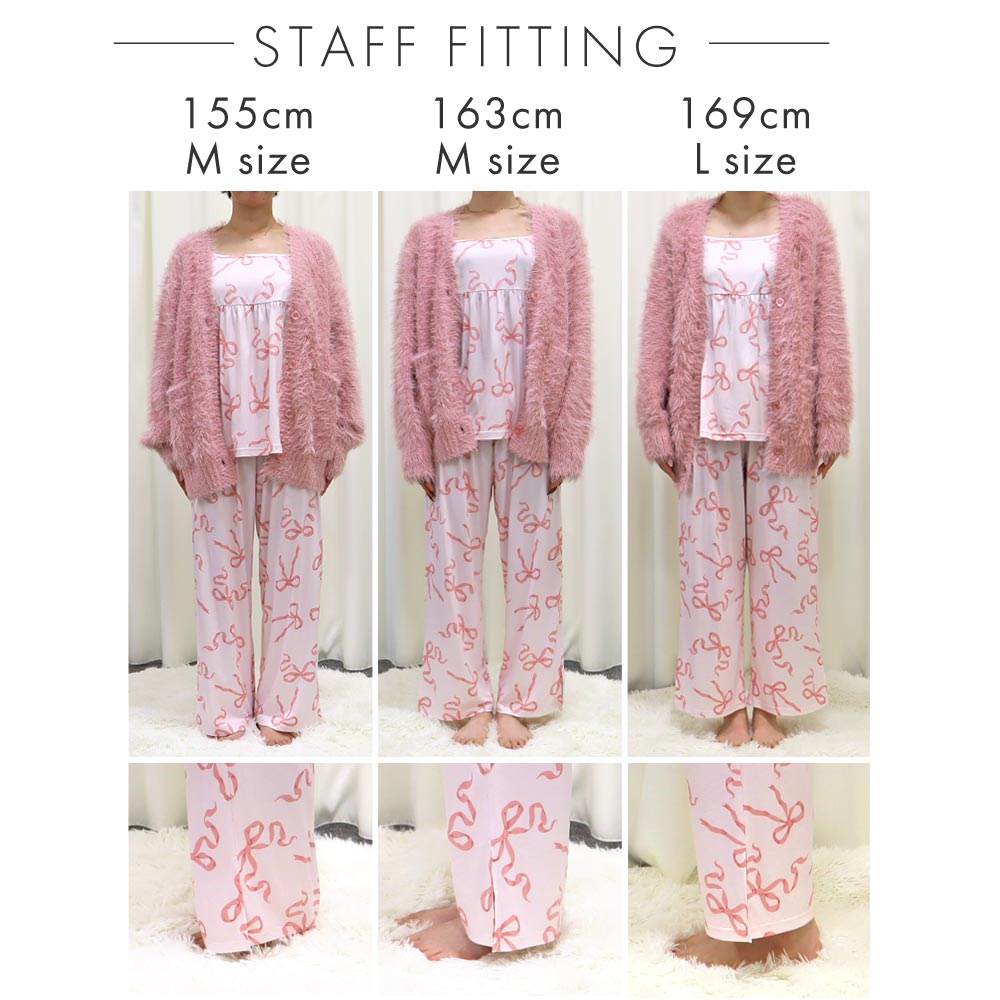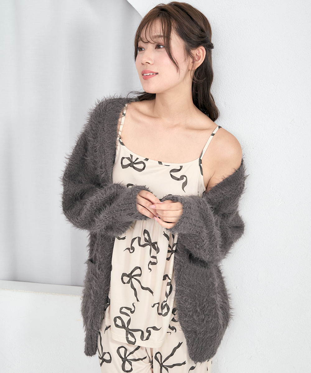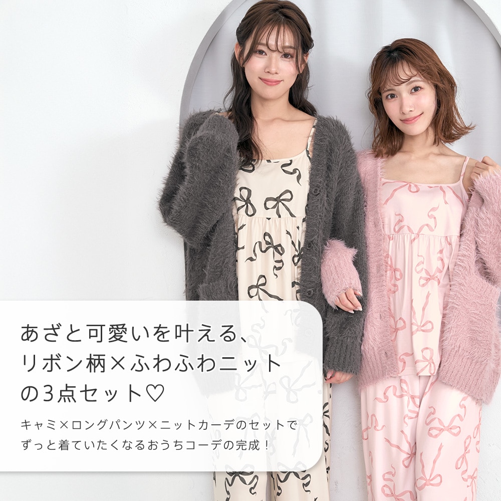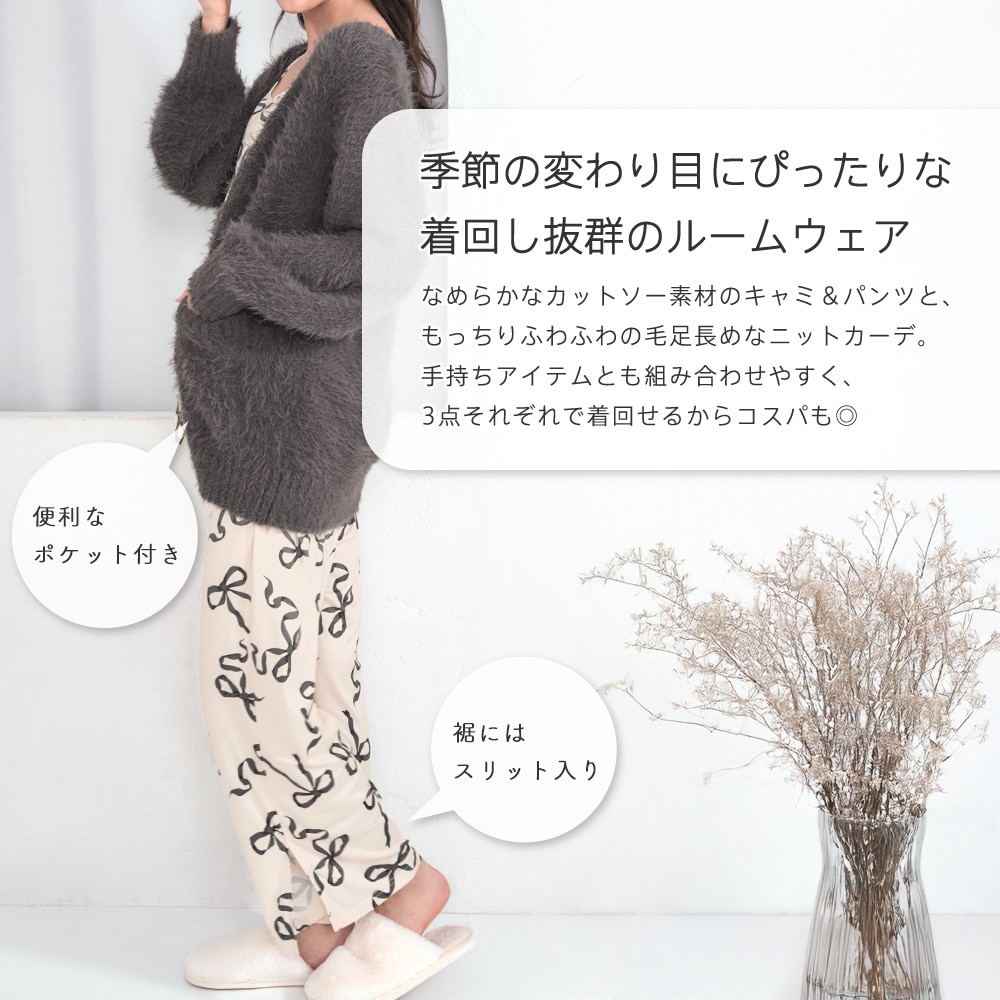 リボン柄キャミソール シャギーニットカーディガン付き 長袖 3点セット