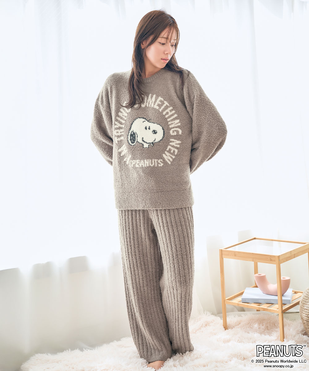 人気コミック『PEANUTS(ピーナッツ)』に登場するスヌーピー、ウッドストック、ベルをあしらったシンプルで大人可愛い上下セットのルームウェアです。おもわずギュッとハグしたくなる、ふんわりもっちりとしたマシュマロのようなさわり心地のニット素材で、秋冬の肌寒い季節にもあたたかく過ごせます。大きすぎないゆったりとした程よいサイズ感で、部屋着やパジャマ代わりのナイトウェアとしても最適。トップスはカラーによって異なるイラストをほどこしました。ボトムスはリブ生地を採用しており年齢を問わず着用いただけるシンプルなデザイン。ワントーンの配色で落ち着いた大人テイストに仕上げました。PEANUTSの仲間たちが好きなご家族・お友達へのプレゼントにもオススメのリラックスウェアです。