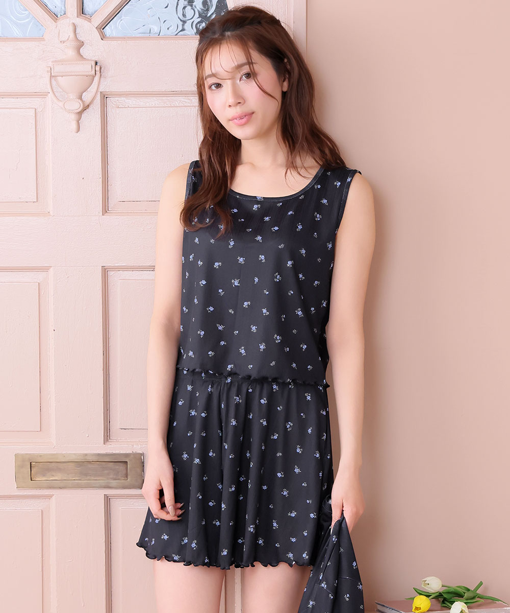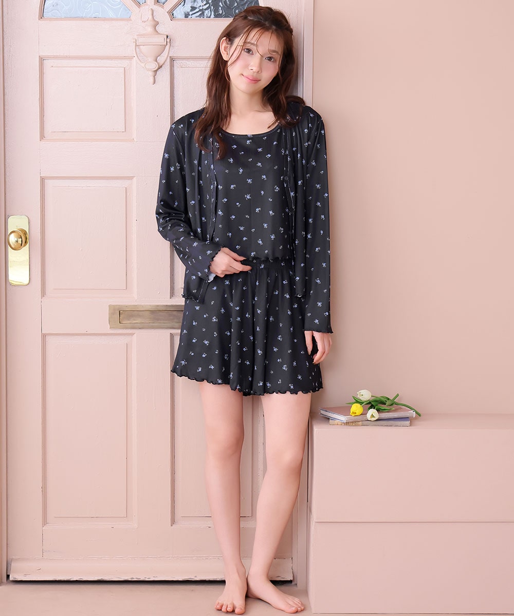 コーデいらずで可愛い、大人フェミニンなおうちスタイル。小花柄をプリントしたやわらかな針抜き生地の、タンクトップ・カーディガン・ショートパンツのセットアイテムです。着るだけで可愛いおうちコーデが完成する、便利なリラックスウェアです。