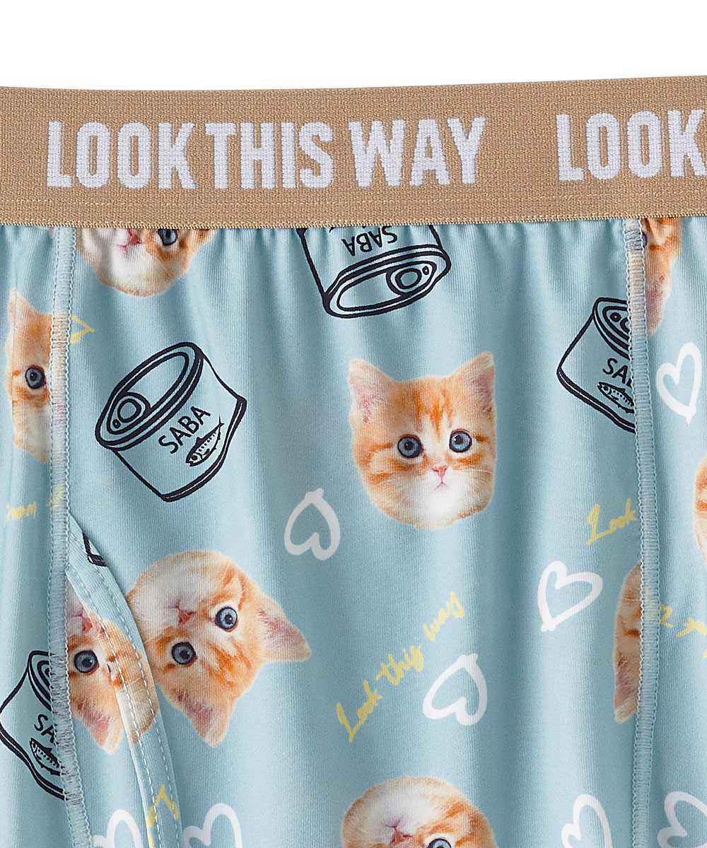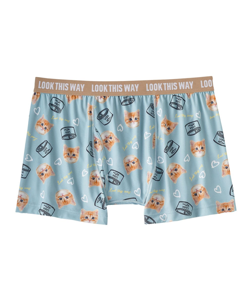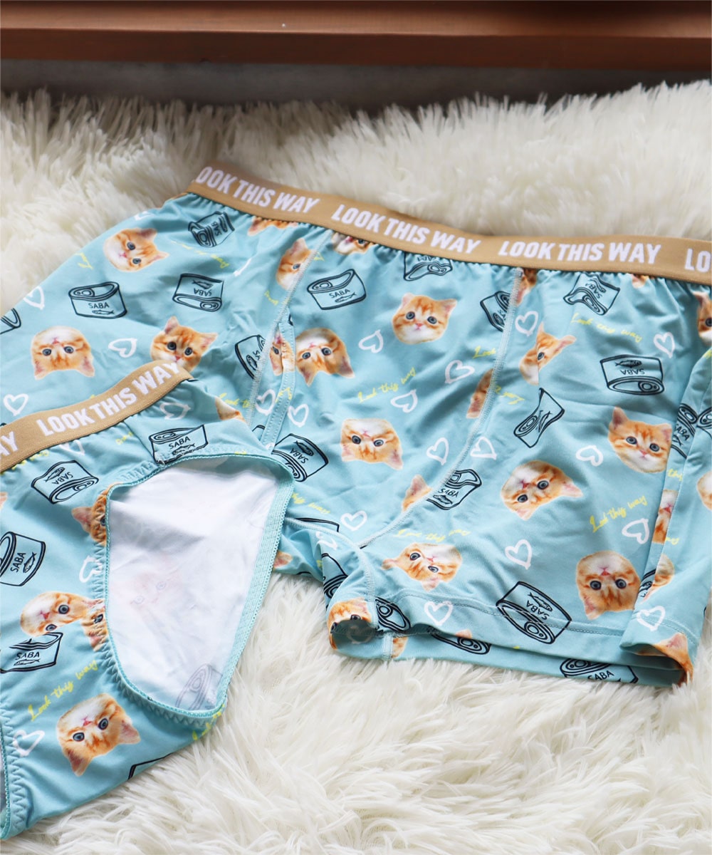 可愛らしい茶トラの猫とサバ缶のイラストをぎゅっと詰め込んだメンズショーツです。伸縮性のある柔らかい生地はサラリとした肌触りのはき心地で、デイリーに使いやすいボクサータイプ。前開き仕様なので股の部分にマチがあり、少しゆったりした形になっています。別売りのレディースショーツと一緒にカップルでこっそりお揃いコーデも楽しめるので、ご家族や彼氏、お友達へのプレゼントにもオススメ。