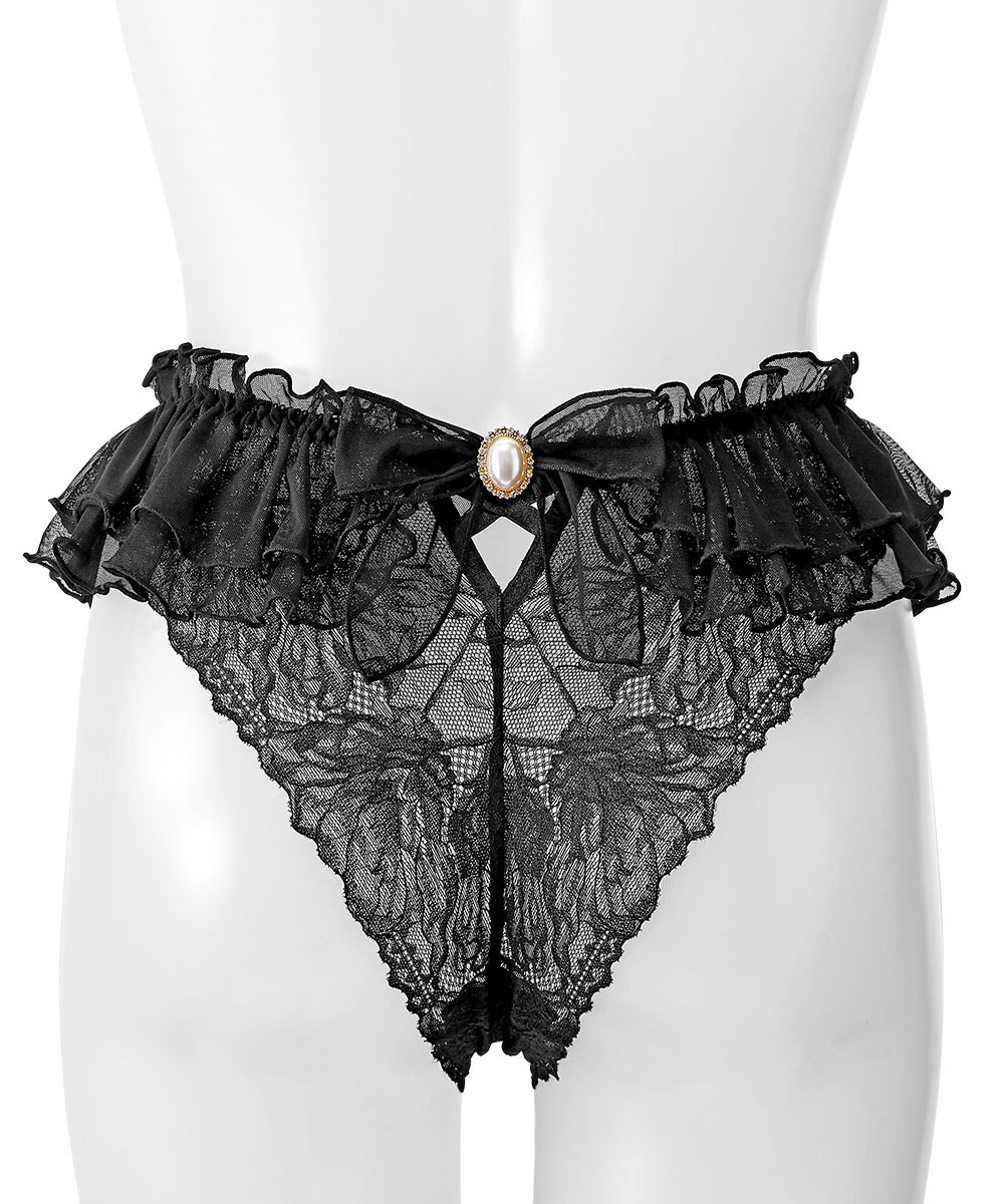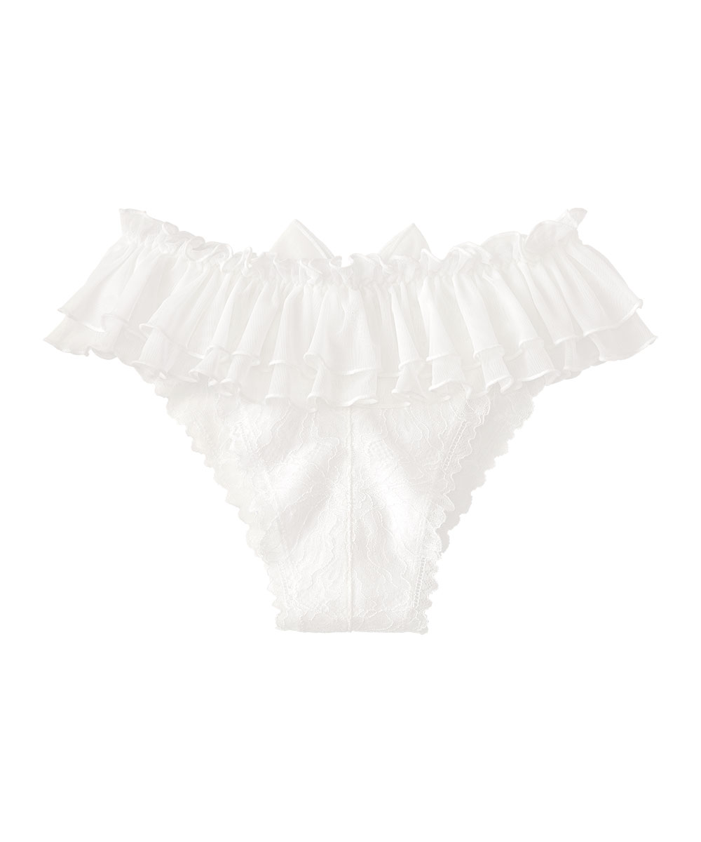 ウエストに大きな2段チュールフリルをあしらった、華やかで可愛いハーフバックショーツ。取り外し可能なパールジュエリー付きリボンがアクセントになり、特別感のあるデザインに仕上がっています。バックスタイルは、総レースにクロスコードを組み合わせたセクシーな仕様。素肌がほんのり透ける繊細なレースが、ヒップラインをより魅力的に引き立てます。ストレッチ性と通気性に優れたレース生地は、ムレを軽減して快適な履き心地をキープ。プレーンショーツの後ろ身頃を下半分だけカットしたような浅めの履き込みのハーフバック(チーキー)は、ヒップの丸みをきれいに魅せる人気のデザイン。大きなフリルが揺れるたびに気分もふわっと高まるセクシーショーツです。