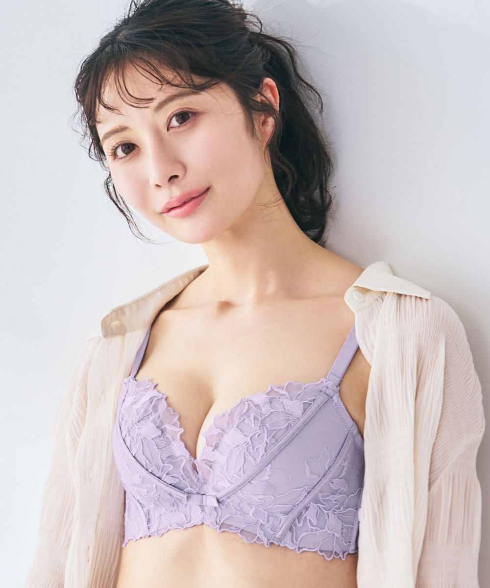 ふっくら下厚カップと脇高設計でワイヤーなしでもしっかり盛れる大人気の超盛ブラ(R)のノンワイヤータイプ。ワイヤーが苦手でも女性らしいデザインで気分を上げたい方におすすめのブラセットです。豪華な花柄の刺繍レースをほどこしたロマンティックなデザインに、リボンでラッピングされているようなキュートさもプラス。レースの切り替えラインと刺繍レース全体でカップを包み込むことで、さらに谷間寄せが可能になりました。見た目の美しさと機能性を兼ね備えたこだわりのデザインは、デイリーシーンだけでなくデートにも。下厚超盛パッドでボリュームのある谷間をメイクしながらサイドの脇高ボーンで集めたお肉をしっかりキープするため、背中から脇にかけてスッキリとした見た目が叶います。