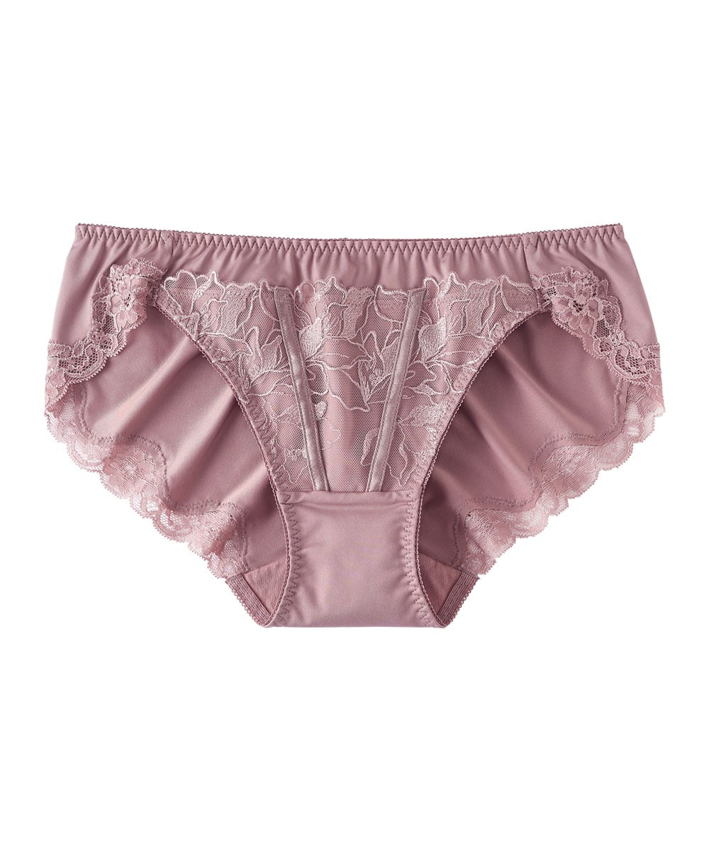 豪華な花柄の刺繍レースをほどこしたロマンティックなデザインのプレーンショーツ。伸縮性のある身生地と脚ぐり部分の柔らかなストレッチレースでお腹とお尻にフィットし、包み込むような安心感でデイリーユースにもぴったり。