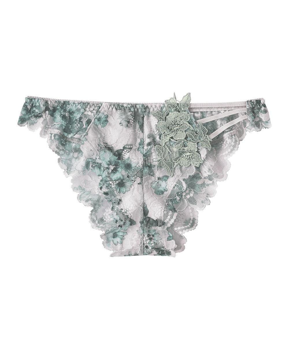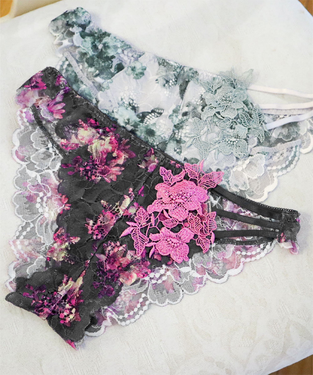 繊細なレース生地にモノトーンの花柄をプリントした、シックでモードな雰囲気のあるハーフバックショーツです。フロント部分に花柄のモチーフレースをあしらい、クールな配色でも大人かわいいデザインに仕上げました。ヒップの丸みがきれいに見えるハーフバック(チーキー)スタイルは、プレーンショーツの安心感とTバックショーツの響きにくさのイイとこ取りをした形。サイドからバックスタイルに使用しているストレッチレースは伸縮性が高く身体にぴったりとフィットし、透け感がありながらお尻全体を包んでくれる安心感があります。右サイドとバックスタイル中央のコードからのぞく肌見せ具合がSEXYなショーツです。