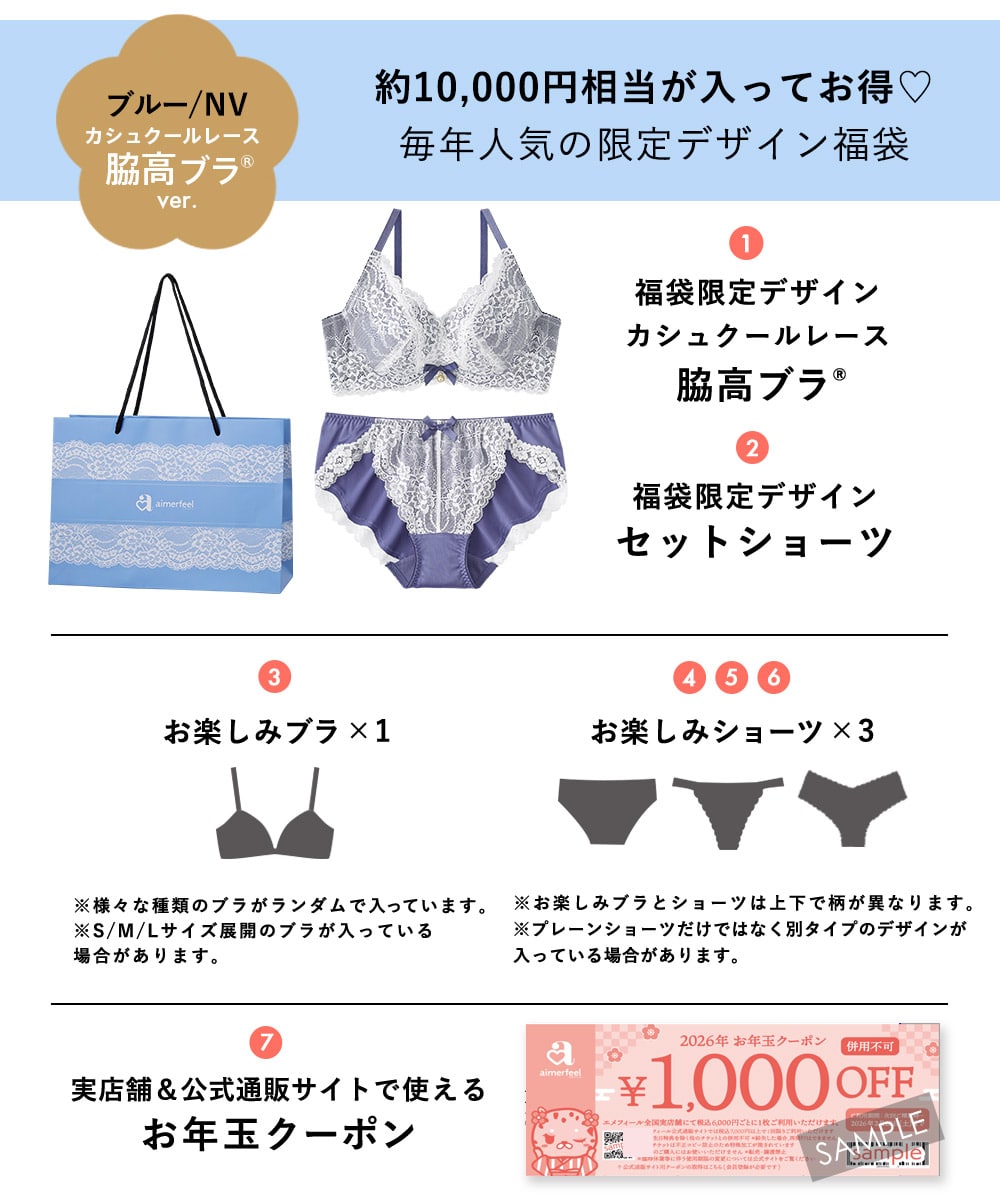 あなたはどっちにする?aimerfeelの2026年HAPPY BAG福袋は、なんと約10,000円相当のアイテムが詰まったお得なセットです!限定デザインのブラジャーは、驚くほどのボリューム感を実現する「超盛ブラ(R)」と、機能性抜群の大人気アイテム「カシュクールレース脇高ブラ(R)」の2種類をご用意。さらに、内容は《限定デザインブラ》《限定セットショーツ》《お楽しみブラ×1》《お楽しみショーツ×3》《お年玉クーポン》の豪華7点セット!これらがすべて4,500円(税込)で手に入るチャンスをお見逃しなく。お得がぎっしり詰まったこの福袋で、新年を華やかにスタートしましょう!